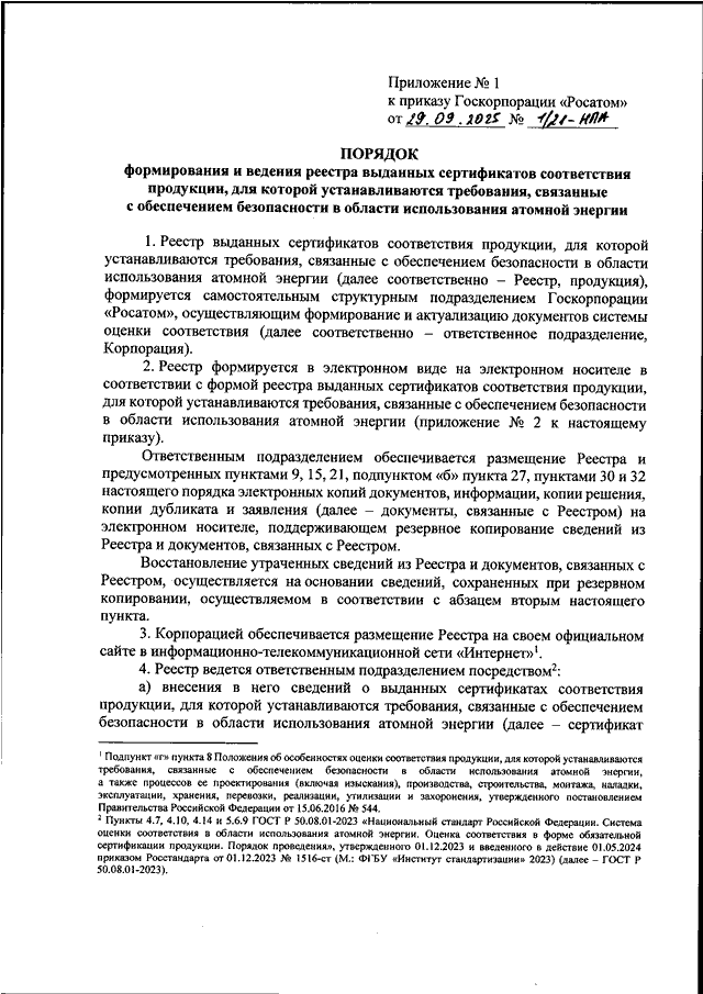 "Росатом" от 29.09.2025 N 1/21-НПА "ОБ УТВЕРЖДЕНИИ ПОРЯДКА ФОРМИРОВАНИЯ И ВЕДЕНИЯ РЕЕСТРА ВЫДАННЫХ СЕРТИФИКАТОВ СООТВЕТСТВИЯ ПРОДУКЦИИ, ДЛЯ КОТОРОЙ УСТАНАВЛИВАЮТСЯ ТРЕБОВАНИЯ, СВЯЗАННЫЕ С ОБЕСПЕЧЕНИЕМ БЕЗОПАСНОСТИ В ОБЛАСТИ ИСПОЛЬЗОВАНИЯ АТОМНОЙ ЭНЕРГИИ, И ФОРМЫ УКАЗАННОГО РЕЕСТРА"