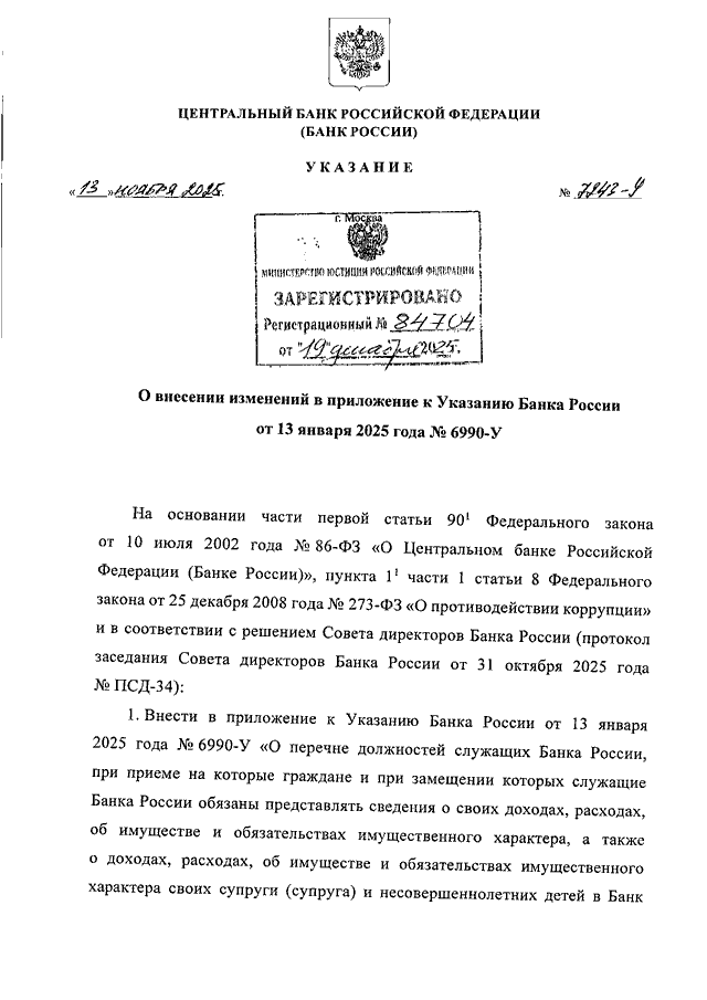 "О ВНЕСЕНИИ ИЗМЕНЕНИЙ В ПРИЛОЖЕНИЕ К УКАЗАНИЮ БАНКА РОССИИ ОТ 13 ЯНВАРЯ 2025 Г. N 6990-У"