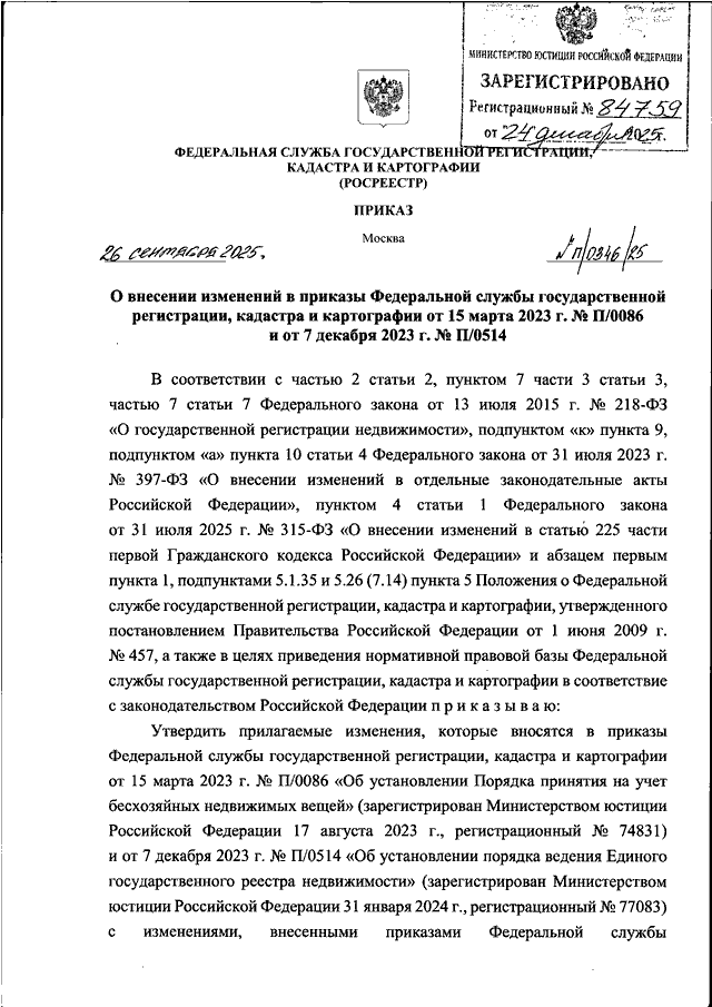 "О ВНЕСЕНИИ ИЗМЕНЕНИЙ В ПРИКАЗЫ ФЕДЕРАЛЬНОЙ СЛУЖБЫ ГОСУДАРСТВЕННОЙ РЕГИСТРАЦИИ, КАДАСТРА И КАРТОГРАФИИ ОТ 15 МАРТА 2023 Г. N П/0086 И ОТ 7 ДЕКАБРЯ 2023 Г. N П/0514"