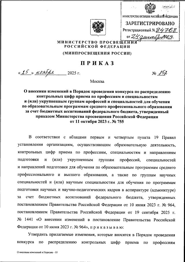 ПРИКАЗ Минпросвещения России от 25.11.2025 N 852