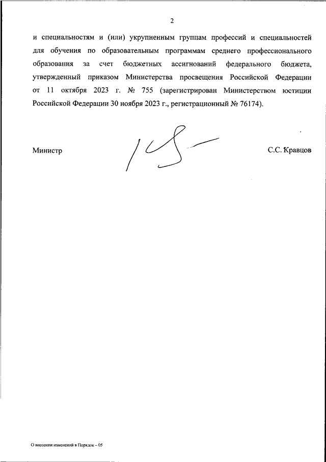 "О ВНЕСЕНИИ ИЗМЕНЕНИЙ В ПОРЯДОК ПРОВЕДЕНИЯ КОНКУРСА ПО РАСПРЕДЕЛЕНИЮ КОНТРОЛЬНЫХ ЦИФР ПРИЕМА ПО ПРОФЕССИЯМ И СПЕЦИАЛЬНОСТЯМ И (ИЛИ) УКРУПНЕННЫМ ГРУППАМ ПРОФЕССИЙ И СПЕЦИАЛЬНОСТЕЙ ДЛЯ ОБУЧЕНИЯ ПО ОБРАЗОВАТЕЛЬНЫМ ПРОГРАММАМ СРЕДНЕГО ПРОФЕССИОНАЛЬНОГО ОБРАЗОВАНИЯ ЗА СЧЕТ БЮДЖЕТНЫХ АССИГНОВАНИЙ ФЕДЕРАЛЬНОГО БЮДЖЕТА, УТВЕРЖДЕННЫЙ ПРИКАЗОМ МИНИСТЕРСТВА ПРОСВЕЩЕНИЯ РОССИЙСКОЙ ФЕДЕРАЦИИ ОТ 11 ОКТЯБРЯ 2023 Г. N 755"