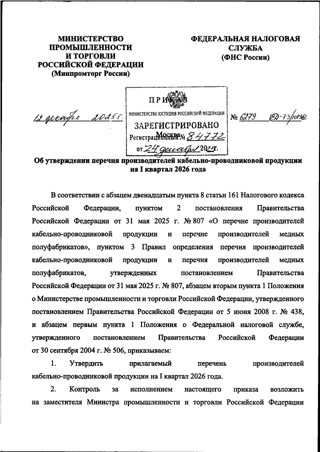 ПРИКАЗ Минпромторга РФ N 6279, ФНС РФ N ЕД-7-20/1083@ от 12.12.2025