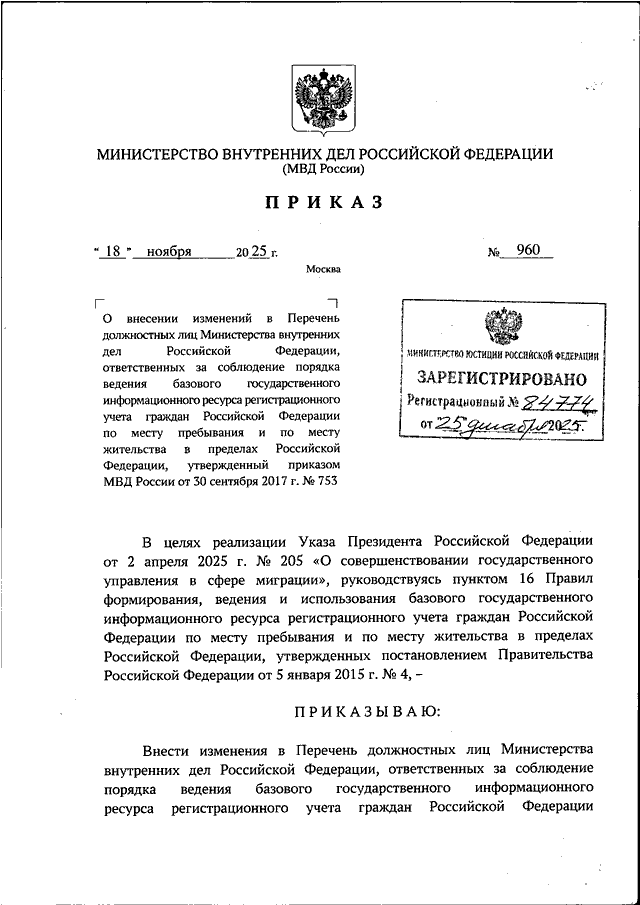 ПРИКАЗ МВД РФ от 18.11.2025 N 960