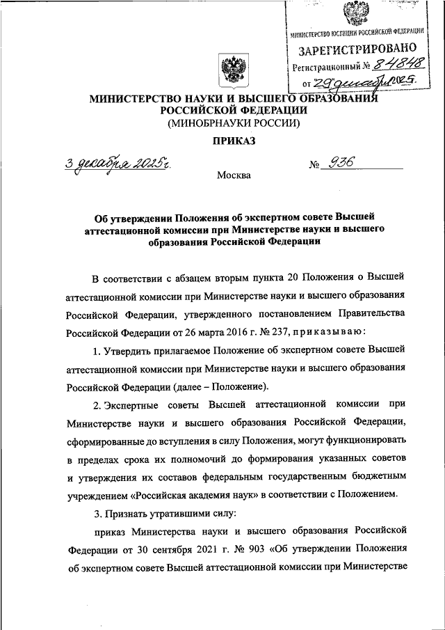 ПРИКАЗ Минобрнауки РФ от 03.12.2025 N 936