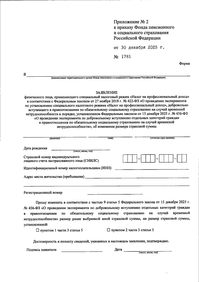 "ОБ УТВЕРЖДЕНИИ ФОРМ ДОКУМЕНТОВ, ИСПОЛЬЗУЕМЫХ УЧАСТНИКАМИ ЭКСПЕРИМЕНТА ПО ДОБРОВОЛЬНОМУ ВСТУПЛЕНИЮ ОТДЕЛЬНЫХ КАТЕГОРИЙ ГРАЖДАН В ПРАВООТНОШЕНИЯ ПО ОБЯЗАТЕЛЬНОМУ СОЦИАЛЬНОМУ СТРАХОВАНИЮ НА СЛУЧАЙ ВРЕМЕННОЙ НЕТРУДОСПОСОБНОСТИ ПРИ РЕГИСТРАЦИИ ЛИЦ, ДОБРОВОЛЬНО ВСТУПИВШИХ В ПРАВООТНОШЕНИЯ ПО ОБЯЗАТЕЛЬНОМУ СОЦИАЛЬНОМУ СТРАХОВАНИЮ НА СЛУЧАЙ ВРЕМЕННОЙ НЕТРУДОСПОСОБНОСТИ, ПРЕКРАЩЕНИИ ТАКИХ ПРАВООТНОШЕНИЙ, ИЗМЕНЕНИИ РАЗМЕРА СТРАХОВОЙ СУММЫ, ПРИОБРЕТЕНИИ ФИЗИЧЕСКИМИ ЛИЦАМИ, ПРИМЕНЯЮЩИМИ СПЕЦИАЛЬНЫЙ НАЛОГОВЫЙ РЕЖИМ "НАЛОГ НА ПРОФЕССИОНАЛЬНЫЙ ДОХОД" В СООТВЕТСТВИИ С ФЕДЕРАЛЬНЫМ ЗАКОНОМ ОТ 27 НОЯБРЯ 2018 Г. N 422-ФЗ "О ПРОВЕДЕНИИ ЭКСПЕРИМЕНТА ПО УСТАНОВЛЕНИЮ СПЕЦИАЛЬНОГО НАЛОГОВОГО РЕЖИМА "НАЛОГ НА ПРОФЕССИОНАЛЬНЫЙ ДОХОД", ДОБРОВОЛЬНО ВСТУПИВШИМИ В ПРАВООТНОШЕНИЯ ПО ОБЯЗАТЕЛЬНОМУ СОЦИАЛЬНОМУ СТРАХОВАНИЮ НА СЛУЧАЙ ВРЕМЕННОЙ НЕТРУДОСПОСОБНОСТИ В ПОРЯДКЕ, УСТАНОВЛЕННОМ ФЕДЕРАЛЬНЫМ ЗАКОНОМ ОТ 15 ДЕКАБРЯ 2025 Г. N 456-ФЗ "О ПРОВЕДЕНИИ ЭКСПЕРИМЕНТА ПО ДОБРОВОЛЬНОМУ ВСТУПЛЕНИЮ ОТДЕЛЬНЫХ КАТЕГОРИЙ ГРАЖДАН В ПРАВООТНОШЕНИЯ ПО ОБЯЗАТЕЛЬНОМУ СОЦИАЛЬНОМУ СТРАХОВАНИЮ НА СЛУЧАЙ ВРЕМЕННОЙ НЕТРУДОСПОСОБНОСТИ", ПРАВА НА ПОЛУЧЕНИЕ СТРАХОВОГО ОБЕСПЕЧЕНИЯ"