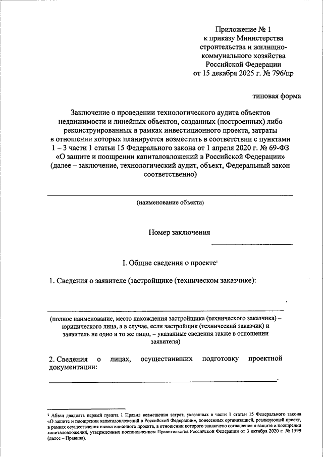 "ОБ УТВЕРЖДЕНИИ ТИПОВОЙ ФОРМЫ ЗАКЛЮЧЕНИЯ О ПРОВЕДЕНИИ ТЕХНОЛОГИЧЕСКОГО АУДИТА ОБЪЕКТОВ НЕДВИЖИМОСТИ И ЛИНЕЙНЫХ ОБЪЕКТОВ, СОЗДАННЫХ (ПОСТРОЕННЫХ) ЛИБО РЕКОНСТРУИРОВАННЫХ В РАМКАХ ИНВЕСТИЦИОННОГО ПРОЕКТА, ЗАТРАТЫ В ОТНОШЕНИИ КОТОРЫХ ПЛАНИРУЕТСЯ ВОЗМЕСТИТЬ В СООТВЕТСТВИИ С ПУНКТАМИ 1 - 3 ЧАСТИ 1 СТАТЬИ 15 ФЕДЕРАЛЬНОГО ЗАКОНА ОТ 1 АПРЕЛЯ 2020 Г. N 69-ФЗ "О ЗАЩИТЕ И ПООЩРЕНИИ КАПИТАЛОВЛОЖЕНИЙ В РОССИЙСКОЙ ФЕДЕРАЦИИ", И ТРЕБОВАНИЙ К ОФОРМЛЕНИЮ ТАКОГО ЗАКЛЮЧЕНИЯ"