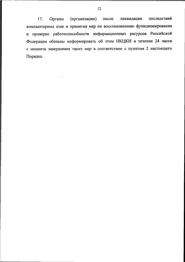 "ОБ УТВЕРЖДЕНИИ ПОРЯДКА ИНФОРМИРОВАНИЯ ФСБ РОССИИ О КОМПЬЮТЕРНЫХ АТАКАХ И КОМПЬЮТЕРНЫХ ИНЦИДЕНТАХ, РЕАГИРОВАНИЯ НА НИХ, ПРИНЯТИЯ МЕР ПО ЛИКВИДАЦИИ ПОСЛЕДСТВИЙ КОМПЬЮТЕРНЫХ АТАК, ПРОВЕДЕННЫХ В ОТНОШЕНИИ ЗНАЧИМЫХ ОБЪЕКТОВ КРИТИЧЕСКОЙ ИНФОРМАЦИОННОЙ ИНФРАСТРУКТУРЫ РОССИЙСКОЙ ФЕДЕРАЦИИ И ИНЫХ ИНФОРМАЦИОННЫХ РЕСУРСОВ РОССИЙСКОЙ ФЕДЕРАЦИИ, ПРИНАДЛЕЖАЩИХ ОРГАНАМ И ОРГАНИЗАЦИЯМ, НА КОТОРЫЕ ВОЗЛОЖЕНЫ ОБЯЗАННОСТИ, ПРЕДУСМОТРЕННЫЕ ЧАСТЬЮ 4 СТАТЬИ 9 ФЕДЕРАЛЬНОГО ЗАКОНА ОТ 26 ИЮЛЯ 2017 Г. N 187 ФЗ "О БЕЗОПАСНОСТИ КРИТИЧЕСКОЙ ИНФОРМАЦИОННОЙ ИНФРАСТРУКТУРЫ РОССИЙСКОЙ ФЕДЕРАЦИИ"