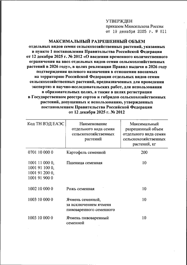 ПРИКАЗ Минсельхоза РФ от 19.12.2025 N 811
