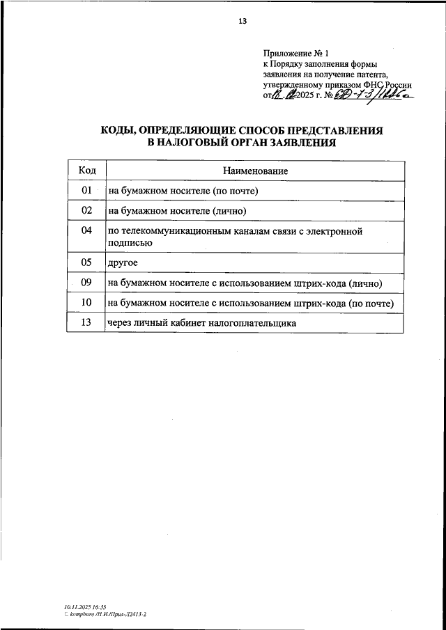 "ОБ УТВЕРЖДЕНИИ ФОРМЫ ЗАЯВЛЕНИЯ НА ПОЛУЧЕНИЕ ПАТЕНТА, ПОРЯДКА ЕЕ ЗАПОЛНЕНИЯ, ФОРМАТА ПРЕДСТАВЛЕНИЯ ЗАЯВЛЕНИЯ НА ПОЛУЧЕНИЕ ПАТЕНТА В ЭЛЕКТРОННОЙ ФОРМЕ"