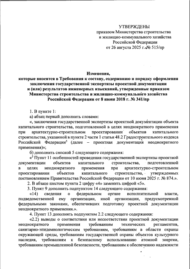"О ВНЕСЕНИИ ИЗМЕНЕНИЙ В ТРЕБОВАНИЯ К СОСТАВУ, СОДЕРЖАНИЮ И ПОРЯДКУ ОФОРМЛЕНИЯ ЗАКЛЮЧЕНИЯ ГОСУДАРСТВЕННОЙ ЭКСПЕРТИЗЫ ПРОЕКТНОЙ ДОКУМЕНТАЦИИ И (ИЛИ) РЕЗУЛЬТАТОВ ИНЖЕНЕРНЫХ ИЗЫСКАНИЙ, УТВЕРЖДЕННЫЕ ПРИКАЗОМ МИНИСТЕРСТВА СТРОИТЕЛЬСТВА И ЖИЛИЩНО - КОММУНАЛЬНОГО ХОЗЯЙСТВА РОССИЙСКОЙ ФЕДЕРАЦИИ ОТ 8 ИЮНЯ 2018 Г. N 341/ПР"