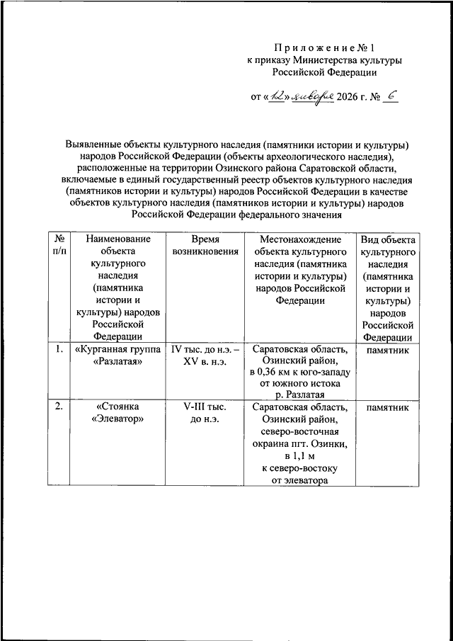 "О ВКЛЮЧЕНИИ ВЫЯВЛЕННЫХ ОБЪЕКТОВ КУЛЬТУРНОГО НАСЛЕДИЯ (ПАМЯТНИКОВ ИСТОРИИ И КУЛЬТУРЫ) НАРОДОВ РОССИЙСКОЙ ФЕДЕРАЦИИ (ОБЪЕКТОВ АРХЕОЛОГИЧЕСКОГО НАСЛЕДИЯ), РАСПОЛОЖЕННЫХ НА ТЕРРИТОРИИ ОЗИНСКОГО РАЙОНА САРАТОВСКОЙ ОБЛАСТИ, В ЕДИНЫЙ ГОСУДАРСТВЕННЫЙ РЕЕСТР ОБЪЕКТОВ КУЛЬТУРНОГО НАСЛЕДИЯ (ПАМЯТНИКОВ ИСТОРИИ И КУЛЬТУРЫ) НАРОДОВ РОССИЙСКОЙ ФЕДЕРАЦИИ В КАЧЕСТВЕ ОБЪЕКТОВ КУЛЬТУРНОГО НАСЛЕДИЯ (ПАМЯТНИКОВ ИСТОРИИ И КУЛЬТУРЫ) НАРОДОВ РОССИЙСКОЙ ФЕДЕРАЦИИ ФЕДЕРАЛЬНОГО ЗНАЧЕНИЯ И УТВЕРЖДЕНИИ ГРАНИЦ ИХ ТЕРРИТОРИЙ"