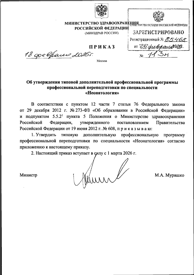 ПРИКАЗ Минздрава РФ от 18.02.2026 N 113н