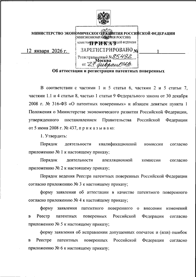 ПРИКАЗ Минэкономразвития РФ от 12.01.2026 N 1