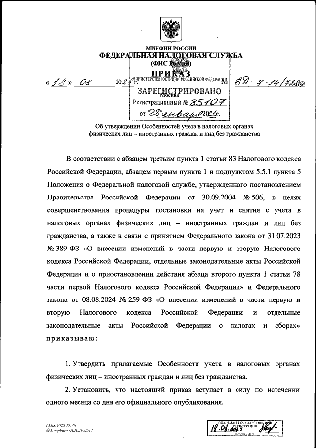 "ОБ УТВЕРЖДЕНИИ ОСОБЕННОСТЕЙ УЧЕТА В НАЛОГОВЫХ ОРГАНАХ ФИЗИЧЕСКИХ ЛИЦ - ИНОСТРАННЫХ ГРАЖДАН И ЛИЦ БЕЗ ГРАЖДАНСТВА"