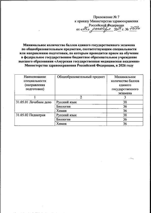 "ОБ УСТАНОВЛЕНИИ МИНИМАЛЬНОГО КОЛИЧЕСТВА БАЛЛОВ ЕДИНОГО ГОСУДАРСТВЕННОГО ЭКЗАМЕНА ПО ОБЩЕОБРАЗОВАТЕЛЬНЫМ ПРЕДМЕТАМ, СООТВЕТСТВУЮЩИМ СПЕЦИАЛЬНОСТИ ИЛИ НАПРАВЛЕНИЮ ПОДГОТОВКИ, ПО КОТОРЫМ ПРОВОДИТСЯ ПРИЕМ НА ОБУЧЕНИЕ В ОБРАЗОВАТЕЛЬНЫХ ОРГАНИЗАЦИЯХ, НАХОДЯЩИХСЯ В ВЕДЕНИИ МИНИСТЕРСТВА ЗДРАВООХРАНЕНИЯ РОССИЙСКОЙ ФЕДЕРАЦИИ, НА 2026 ГОД"