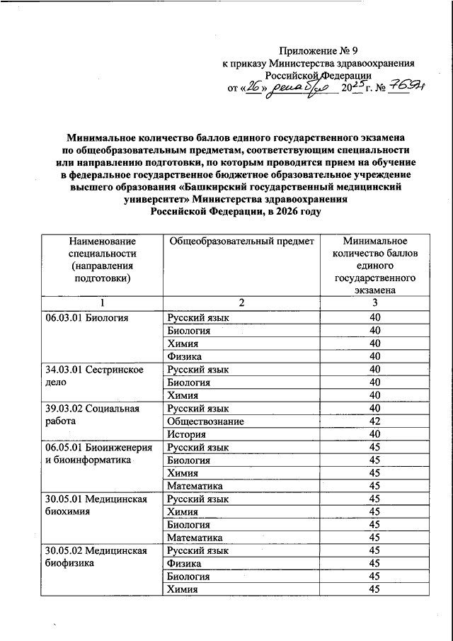 "ОБ УСТАНОВЛЕНИИ МИНИМАЛЬНОГО КОЛИЧЕСТВА БАЛЛОВ ЕДИНОГО ГОСУДАРСТВЕННОГО ЭКЗАМЕНА ПО ОБЩЕОБРАЗОВАТЕЛЬНЫМ ПРЕДМЕТАМ, СООТВЕТСТВУЮЩИМ СПЕЦИАЛЬНОСТИ ИЛИ НАПРАВЛЕНИЮ ПОДГОТОВКИ, ПО КОТОРЫМ ПРОВОДИТСЯ ПРИЕМ НА ОБУЧЕНИЕ В ОБРАЗОВАТЕЛЬНЫХ ОРГАНИЗАЦИЯХ, НАХОДЯЩИХСЯ В ВЕДЕНИИ МИНИСТЕРСТВА ЗДРАВООХРАНЕНИЯ РОССИЙСКОЙ ФЕДЕРАЦИИ, НА 2026 ГОД"
