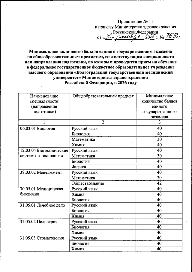 "ОБ УСТАНОВЛЕНИИ МИНИМАЛЬНОГО КОЛИЧЕСТВА БАЛЛОВ ЕДИНОГО ГОСУДАРСТВЕННОГО ЭКЗАМЕНА ПО ОБЩЕОБРАЗОВАТЕЛЬНЫМ ПРЕДМЕТАМ, СООТВЕТСТВУЮЩИМ СПЕЦИАЛЬНОСТИ ИЛИ НАПРАВЛЕНИЮ ПОДГОТОВКИ, ПО КОТОРЫМ ПРОВОДИТСЯ ПРИЕМ НА ОБУЧЕНИЕ В ОБРАЗОВАТЕЛЬНЫХ ОРГАНИЗАЦИЯХ, НАХОДЯЩИХСЯ В ВЕДЕНИИ МИНИСТЕРСТВА ЗДРАВООХРАНЕНИЯ РОССИЙСКОЙ ФЕДЕРАЦИИ, НА 2026 ГОД"