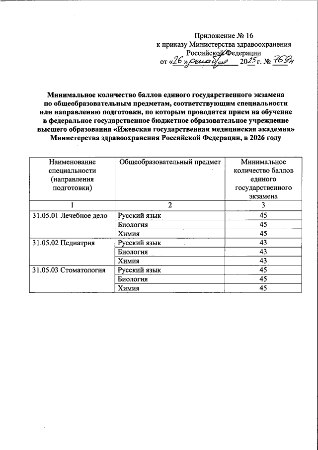 "ОБ УСТАНОВЛЕНИИ МИНИМАЛЬНОГО КОЛИЧЕСТВА БАЛЛОВ ЕДИНОГО ГОСУДАРСТВЕННОГО ЭКЗАМЕНА ПО ОБЩЕОБРАЗОВАТЕЛЬНЫМ ПРЕДМЕТАМ, СООТВЕТСТВУЮЩИМ СПЕЦИАЛЬНОСТИ ИЛИ НАПРАВЛЕНИЮ ПОДГОТОВКИ, ПО КОТОРЫМ ПРОВОДИТСЯ ПРИЕМ НА ОБУЧЕНИЕ В ОБРАЗОВАТЕЛЬНЫХ ОРГАНИЗАЦИЯХ, НАХОДЯЩИХСЯ В ВЕДЕНИИ МИНИСТЕРСТВА ЗДРАВООХРАНЕНИЯ РОССИЙСКОЙ ФЕДЕРАЦИИ, НА 2026 ГОД"