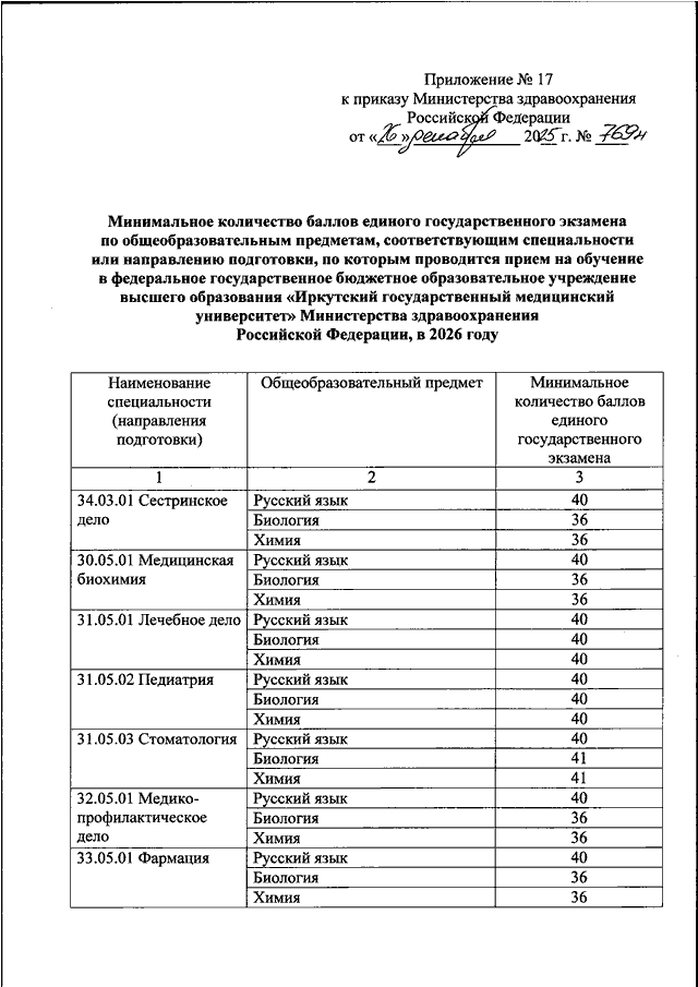 "ОБ УСТАНОВЛЕНИИ МИНИМАЛЬНОГО КОЛИЧЕСТВА БАЛЛОВ ЕДИНОГО ГОСУДАРСТВЕННОГО ЭКЗАМЕНА ПО ОБЩЕОБРАЗОВАТЕЛЬНЫМ ПРЕДМЕТАМ, СООТВЕТСТВУЮЩИМ СПЕЦИАЛЬНОСТИ ИЛИ НАПРАВЛЕНИЮ ПОДГОТОВКИ, ПО КОТОРЫМ ПРОВОДИТСЯ ПРИЕМ НА ОБУЧЕНИЕ В ОБРАЗОВАТЕЛЬНЫХ ОРГАНИЗАЦИЯХ, НАХОДЯЩИХСЯ В ВЕДЕНИИ МИНИСТЕРСТВА ЗДРАВООХРАНЕНИЯ РОССИЙСКОЙ ФЕДЕРАЦИИ, НА 2026 ГОД"