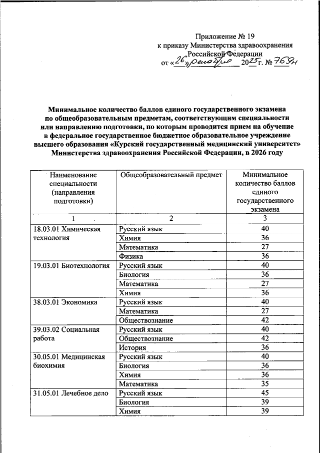 "ОБ УСТАНОВЛЕНИИ МИНИМАЛЬНОГО КОЛИЧЕСТВА БАЛЛОВ ЕДИНОГО ГОСУДАРСТВЕННОГО ЭКЗАМЕНА ПО ОБЩЕОБРАЗОВАТЕЛЬНЫМ ПРЕДМЕТАМ, СООТВЕТСТВУЮЩИМ СПЕЦИАЛЬНОСТИ ИЛИ НАПРАВЛЕНИЮ ПОДГОТОВКИ, ПО КОТОРЫМ ПРОВОДИТСЯ ПРИЕМ НА ОБУЧЕНИЕ В ОБРАЗОВАТЕЛЬНЫХ ОРГАНИЗАЦИЯХ, НАХОДЯЩИХСЯ В ВЕДЕНИИ МИНИСТЕРСТВА ЗДРАВООХРАНЕНИЯ РОССИЙСКОЙ ФЕДЕРАЦИИ, НА 2026 ГОД"