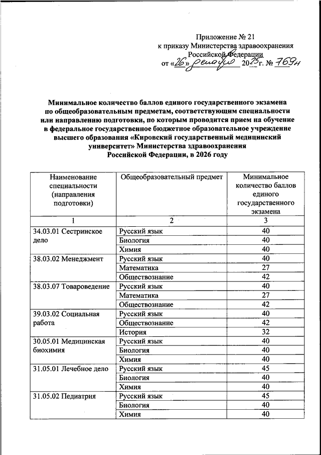 "ОБ УСТАНОВЛЕНИИ МИНИМАЛЬНОГО КОЛИЧЕСТВА БАЛЛОВ ЕДИНОГО ГОСУДАРСТВЕННОГО ЭКЗАМЕНА ПО ОБЩЕОБРАЗОВАТЕЛЬНЫМ ПРЕДМЕТАМ, СООТВЕТСТВУЮЩИМ СПЕЦИАЛЬНОСТИ ИЛИ НАПРАВЛЕНИЮ ПОДГОТОВКИ, ПО КОТОРЫМ ПРОВОДИТСЯ ПРИЕМ НА ОБУЧЕНИЕ В ОБРАЗОВАТЕЛЬНЫХ ОРГАНИЗАЦИЯХ, НАХОДЯЩИХСЯ В ВЕДЕНИИ МИНИСТЕРСТВА ЗДРАВООХРАНЕНИЯ РОССИЙСКОЙ ФЕДЕРАЦИИ, НА 2026 ГОД"