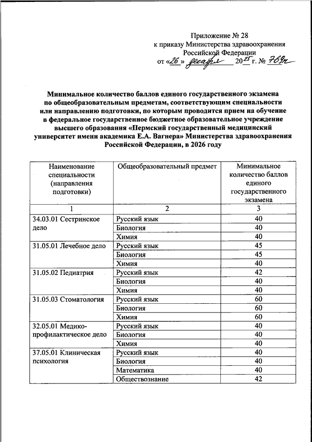 "ОБ УСТАНОВЛЕНИИ МИНИМАЛЬНОГО КОЛИЧЕСТВА БАЛЛОВ ЕДИНОГО ГОСУДАРСТВЕННОГО ЭКЗАМЕНА ПО ОБЩЕОБРАЗОВАТЕЛЬНЫМ ПРЕДМЕТАМ, СООТВЕТСТВУЮЩИМ СПЕЦИАЛЬНОСТИ ИЛИ НАПРАВЛЕНИЮ ПОДГОТОВКИ, ПО КОТОРЫМ ПРОВОДИТСЯ ПРИЕМ НА ОБУЧЕНИЕ В ОБРАЗОВАТЕЛЬНЫХ ОРГАНИЗАЦИЯХ, НАХОДЯЩИХСЯ В ВЕДЕНИИ МИНИСТЕРСТВА ЗДРАВООХРАНЕНИЯ РОССИЙСКОЙ ФЕДЕРАЦИИ, НА 2026 ГОД"
