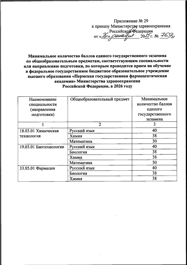 "ОБ УСТАНОВЛЕНИИ МИНИМАЛЬНОГО КОЛИЧЕСТВА БАЛЛОВ ЕДИНОГО ГОСУДАРСТВЕННОГО ЭКЗАМЕНА ПО ОБЩЕОБРАЗОВАТЕЛЬНЫМ ПРЕДМЕТАМ, СООТВЕТСТВУЮЩИМ СПЕЦИАЛЬНОСТИ ИЛИ НАПРАВЛЕНИЮ ПОДГОТОВКИ, ПО КОТОРЫМ ПРОВОДИТСЯ ПРИЕМ НА ОБУЧЕНИЕ В ОБРАЗОВАТЕЛЬНЫХ ОРГАНИЗАЦИЯХ, НАХОДЯЩИХСЯ В ВЕДЕНИИ МИНИСТЕРСТВА ЗДРАВООХРАНЕНИЯ РОССИЙСКОЙ ФЕДЕРАЦИИ, НА 2026 ГОД"