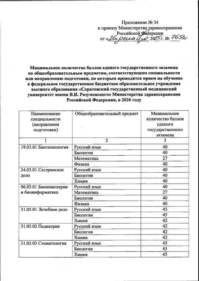 "ОБ УСТАНОВЛЕНИИ МИНИМАЛЬНОГО КОЛИЧЕСТВА БАЛЛОВ ЕДИНОГО ГОСУДАРСТВЕННОГО ЭКЗАМЕНА ПО ОБЩЕОБРАЗОВАТЕЛЬНЫМ ПРЕДМЕТАМ, СООТВЕТСТВУЮЩИМ СПЕЦИАЛЬНОСТИ ИЛИ НАПРАВЛЕНИЮ ПОДГОТОВКИ, ПО КОТОРЫМ ПРОВОДИТСЯ ПРИЕМ НА ОБУЧЕНИЕ В ОБРАЗОВАТЕЛЬНЫХ ОРГАНИЗАЦИЯХ, НАХОДЯЩИХСЯ В ВЕДЕНИИ МИНИСТЕРСТВА ЗДРАВООХРАНЕНИЯ РОССИЙСКОЙ ФЕДЕРАЦИИ, НА 2026 ГОД"