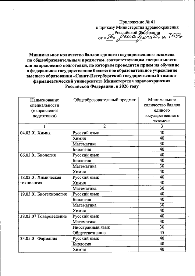"ОБ УСТАНОВЛЕНИИ МИНИМАЛЬНОГО КОЛИЧЕСТВА БАЛЛОВ ЕДИНОГО ГОСУДАРСТВЕННОГО ЭКЗАМЕНА ПО ОБЩЕОБРАЗОВАТЕЛЬНЫМ ПРЕДМЕТАМ, СООТВЕТСТВУЮЩИМ СПЕЦИАЛЬНОСТИ ИЛИ НАПРАВЛЕНИЮ ПОДГОТОВКИ, ПО КОТОРЫМ ПРОВОДИТСЯ ПРИЕМ НА ОБУЧЕНИЕ В ОБРАЗОВАТЕЛЬНЫХ ОРГАНИЗАЦИЯХ, НАХОДЯЩИХСЯ В ВЕДЕНИИ МИНИСТЕРСТВА ЗДРАВООХРАНЕНИЯ РОССИЙСКОЙ ФЕДЕРАЦИИ, НА 2026 ГОД"