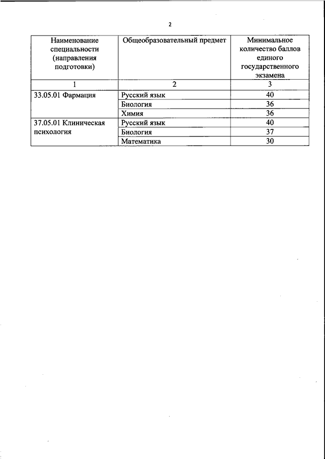 "ОБ УСТАНОВЛЕНИИ МИНИМАЛЬНОГО КОЛИЧЕСТВА БАЛЛОВ ЕДИНОГО ГОСУДАРСТВЕННОГО ЭКЗАМЕНА ПО ОБЩЕОБРАЗОВАТЕЛЬНЫМ ПРЕДМЕТАМ, СООТВЕТСТВУЮЩИМ СПЕЦИАЛЬНОСТИ ИЛИ НАПРАВЛЕНИЮ ПОДГОТОВКИ, ПО КОТОРЫМ ПРОВОДИТСЯ ПРИЕМ НА ОБУЧЕНИЕ В ОБРАЗОВАТЕЛЬНЫХ ОРГАНИЗАЦИЯХ, НАХОДЯЩИХСЯ В ВЕДЕНИИ МИНИСТЕРСТВА ЗДРАВООХРАНЕНИЯ РОССИЙСКОЙ ФЕДЕРАЦИИ, НА 2026 ГОД"