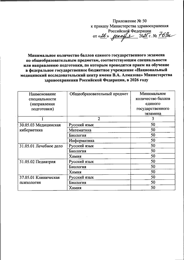 "ОБ УСТАНОВЛЕНИИ МИНИМАЛЬНОГО КОЛИЧЕСТВА БАЛЛОВ ЕДИНОГО ГОСУДАРСТВЕННОГО ЭКЗАМЕНА ПО ОБЩЕОБРАЗОВАТЕЛЬНЫМ ПРЕДМЕТАМ, СООТВЕТСТВУЮЩИМ СПЕЦИАЛЬНОСТИ ИЛИ НАПРАВЛЕНИЮ ПОДГОТОВКИ, ПО КОТОРЫМ ПРОВОДИТСЯ ПРИЕМ НА ОБУЧЕНИЕ В ОБРАЗОВАТЕЛЬНЫХ ОРГАНИЗАЦИЯХ, НАХОДЯЩИХСЯ В ВЕДЕНИИ МИНИСТЕРСТВА ЗДРАВООХРАНЕНИЯ РОССИЙСКОЙ ФЕДЕРАЦИИ, НА 2026 ГОД"