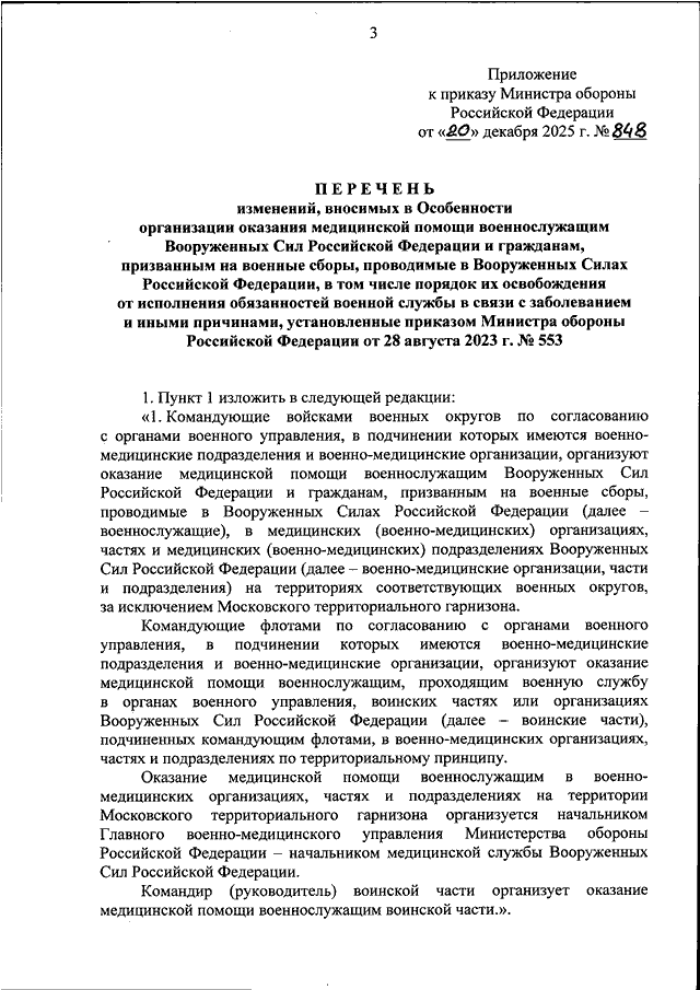 "О ВНЕСЕНИИ ИЗМЕНЕНИЙ В ОСОБЕННОСТИ ОРГАНИЗАЦИИ ОКАЗАНИЯ МЕДИЦИНСКОЙ ПОМОЩИ ВОЕННОСЛУЖАЩИМ ВООРУЖЕННЫХ СИЛ РОССИЙСКОЙ ФЕДЕРАЦИИ И ГРАЖДАНАМ, ПРИЗВАННЫМ НА ВОЕННЫЕ СБОРЫ, ПРОВОДИМЫЕ В ВООРУЖЕННЫХ СИЛАХ РОССИЙСКОЙ ФЕДЕРАЦИИ, В ТОМ ЧИСЛЕ ПОРЯДОК ИХ ОСВОБОЖДЕНИЯ ОТ ИСПОЛНЕНИЯ ОБЯЗАННОСТЕЙ ВОЕННОЙ СЛУЖБЫ В СВЯЗИ С ЗАБОЛЕВАНИЕМ И ИНЫМИ ПРИЧИНАМИ, УСТАНОВЛЕННЫЕ ПРИКАЗОМ МИНИСТРА ОБОРОНЫ РОССИЙСКОЙ ФЕДЕРАЦИИ ОТ 28 АВГУСТА 2023 Г. N 553"