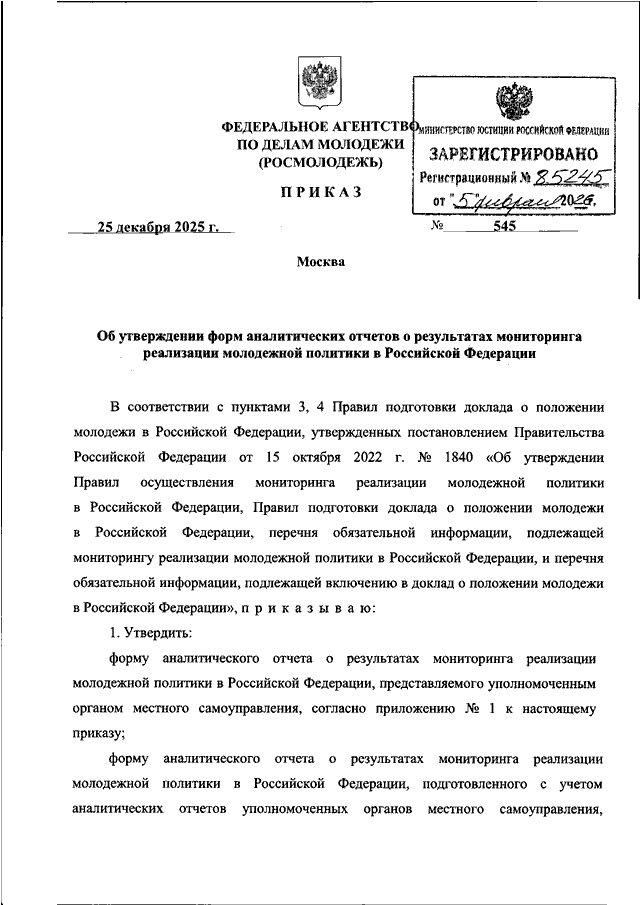ПРИКАЗ Росмолодежи от 25.12.2025 N 545