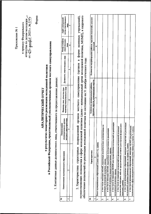 "ОБ УТВЕРЖДЕНИИ ФОРМ АНАЛИТИЧЕСКИХ ОТЧЕТОВ О РЕЗУЛЬТАТАХ МОНИТОРИНГА РЕАЛИЗАЦИИ МОЛОДЕЖНОЙ ПОЛИТИКИ В РОССИЙСКОЙ ФЕДЕРАЦИИ"