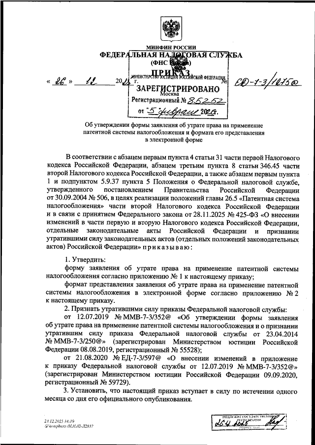 ПРИКАЗ ФНС РФ от 26.12.2025 N ЕД-7-3/1275@