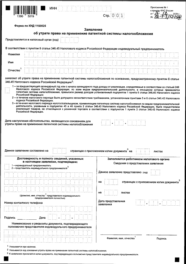 "ОБ УТВЕРЖДЕНИИ ФОРМЫ ЗАЯВЛЕНИЯ ОБ УТРАТЕ ПРАВА НА ПРИМЕНЕНИЕ ПАТЕНТНОЙ СИСТЕМЫ НАЛОГООБЛОЖЕНИЯ И ФОРМАТА ЕГО ПРЕДСТАВЛЕНИЯ В ЭЛЕКТРОННОЙ ФОРМЕ"