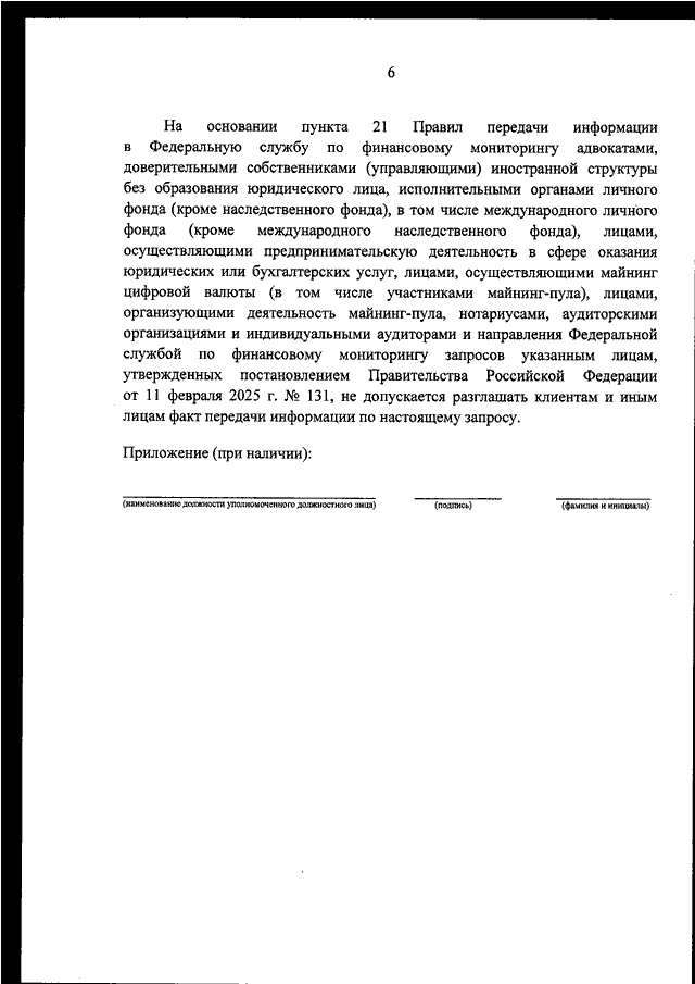 "ОБ УТВЕРЖДЕНИИ ПЕРЕЧНЯ ДОЛЖНОСТНЫХ ЛИЦ ФЕДЕРАЛЬНОЙ СЛУЖБЫ ПО ФИНАНСОВОМУ МОНИТОРИНГУ, ИМЕЮЩИХ ПРАВО НАПРАВЛЯТЬ АДВОКАТАМ, ДОВЕРИТЕЛЬНЫМ СОБСТВЕННИКАМ (УПРАВЛЯЮЩИМ) ИНОСТРАННОЙ СТРУКТУРЫ БЕЗ ОБРАЗОВАНИЯ ЮРИДИЧЕСКОГО ЛИЦА, ИСПОЛНИТЕЛЬНЫМ ОРГАНАМ ЛИЧНОГО ФОНДА (КРОМЕ НАСЛЕДСТВЕННОГО ФОНДА), В ТОМ ЧИСЛЕ МЕЖДУНАРОДНОГО ЛИЧНОГО ФОНДА (КРОМЕ МЕЖДУНАРОДНОГО НАСЛЕДСТВЕННОГО ФОНДА), ЛИЦАМ, ОСУЩЕСТВЛЯЮЩИМ ПРЕДПРИНИМАТЕЛЬСКУЮ ДЕЯТЕЛЬНОСТЬ В СФЕРЕ ОКАЗАНИЯ ЮРИДИЧЕСКИХ ИЛИ БУХГАЛТЕРСКИХ УСЛУГ, ЛИЦАМ, ОСУЩЕСТВЛЯЮЩИМ МАЙНИНГ ЦИФРОВОЙ ВАЛЮТЫ (В ТОМ ЧИСЛЕ УЧАСТНИКАМ МАЙНИНГ-ПУЛА), ЛИЦАМ, ОРГАНИЗУЮЩИМ ДЕЯТЕЛЬНОСТЬ МАЙНИНГ-ПУЛА, НОТАРИУСАМ, АУДИТОРСКИМ ОРГАНИЗАЦИЯМ И ИНДИВИДУАЛЬНЫМ АУДИТОРАМ ЗАПРОСЫ В ЭЛЕКТРОННОЙ ФОРМЕ И В ПИСЬМЕННОМ ВИДЕ О ПРЕДСТАВЛЕНИИ ИНФОРМАЦИИ, А ТАКЖЕ ФОРМ ТАКИХ ПИСЬМЕННЫХ ЗАПРОСОВ"