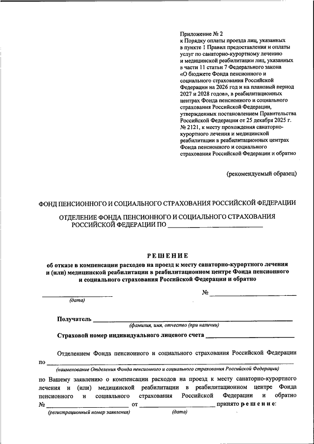 "ОБ УТВЕРЖДЕНИИ ПОРЯДКА ОПЛАТЫ ПРОЕЗДА ЛИЦ, УКАЗАННЫХ В ПУНКТЕ 1 ПРАВИЛ ПРЕДОСТАВЛЕНИЯ И ОПЛАТЫ УСЛУГ ПО САНАТОРНО - КУРОРТНОМУ ЛЕЧЕНИЮ И МЕДИЦИНСКОЙ РЕАБИЛИТАЦИИ ЛИЦ, УКАЗАННЫХ В ЧАСТИ 11 СТАТЬИ 7 ФЕДЕРАЛЬНОГО ЗАКОНА "О БЮДЖЕТЕ ФОНДА ПЕНСИОННОГО И СОЦИАЛЬНОГО СТРАХОВАНИЯ РОССИЙСКОЙ ФЕДЕРАЦИИ НА 2026 ГОД И НА ПЛАНОВЫЙ ПЕРИОД 2027 И 2028 ГОДОВ", В РЕАБИЛИТАЦИОННЫХ ЦЕНТРАХ ФОНДА ПЕНСИОННОГО И СОЦИАЛЬНОГО СТРАХОВАНИЯ РОССИЙСКОЙ ФЕДЕРАЦИИ, УТВЕРЖДЕННЫХ ПОСТАНОВЛЕНИЕМ ПРАВИТЕЛЬСТВА РОССИЙСКОЙ ФЕДЕРАЦИИ ОТ 25 ДЕКАБРЯ 2025 Г. N 2121, К МЕСТУ ПРОХОЖДЕНИЯ САНАТОРНО - КУРОРТНОГО ЛЕЧЕНИЯ И МЕДИЦИНСКОЙ РЕАБИЛИТАЦИИ В РЕАБИЛИТАЦИОННЫХ ЦЕНТРАХ ФОНДА ПЕНСИОННОГО И СОЦИАЛЬНОГО СТРАХОВАНИЯ РОССИЙСКОЙ ФЕДЕРАЦИИ И ОБРАТНО"