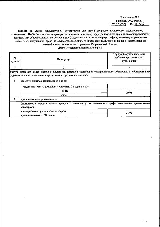 "ОБ УТВЕРЖДЕНИИ ТАРИФОВ НА УСЛУГИ ОБЩЕДОСТУПНОЙ ЭЛЕКТРОСВЯЗИ ДЛЯ ЦЕЛЕЙ ЭФИРНОГО АНАЛОГОВОГО РАДИОВЕЩАНИЯ, ОКАЗЫВАЕМЫЕ ПАО "РОСТЕЛЕКОМ" ОПЕРАТОРУ СВЯЗИ, ОСУЩЕСТВЛЯЮЩЕМУ ЭФИРНУЮ НАЗЕМНУЮ ТРАНСЛЯЦИЮ ОБЩЕРОССИЙСКИХ ОБЯЗАТЕЛЬНЫХ ОБЩЕДОСТУПНЫХ ТЕЛЕКАНАЛОВ И (ИЛИ) РАДИОКАНАЛОВ, А ТАКЖЕ ЭФИРНУЮ ЦИФРОВУЮ НАЗЕМНУЮ ТРАНСЛЯЦИЮ ТЕЛЕКАНАЛОВ, ПОЛУЧИВШИХ ПРАВО НА ОСУЩЕСТВЛЕНИЕ ЭФИРНОГО ЦИФРОВОГО НАЗЕМНОГО ВЕЩАНИЯ С ИСПОЛЬЗОВАНИЕМ ПОЗИЦИЙ В МУЛЬТИПЛЕКСАХ"
