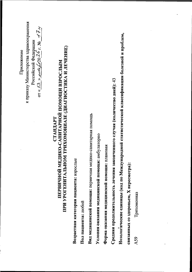 "ОБ УТВЕРЖДЕНИИ СТАНДАРТА ПЕРВИЧНОЙ МЕДИКО - САНИТАРНОЙ ПОМОЩИ ВЗРОСЛЫМ ПРИ УРОГЕНИТАЛЬНОМ ТРИХОМОНИАЗЕ (ДИАГНОСТИКА И ЛЕЧЕНИЕ)"
