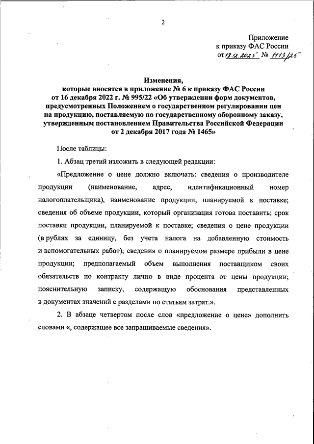 "О ВНЕСЕНИИ ИЗМЕНЕНИЙ В ПРИЛОЖЕНИЕ N 6 К ПРИКАЗУ ФАС РОССИИ ОТ 16 ДЕКАБРЯ 2022 Г. N 995/22 "ОБ УТВЕРЖДЕНИИ ФОРМ ДОКУМЕНТОВ, ПРЕДУСМОТРЕННЫХ ПОЛОЖЕНИЕМ О ГОСУДАРСТВЕННОМ РЕГУЛИРОВАНИИ ЦЕН НА ПРОДУКЦИЮ, ПОСТАВЛЯЕМУЮ ПО ГОСУДАРСТВЕННОМУ ОБОРОННОМУ ЗАКАЗУ, УТВЕРЖДЕННЫМ ПОСТАНОВЛЕНИЕМ ПРАВИТЕЛЬСТВА РОССИЙСКОЙ ФЕДЕРАЦИИ ОТ 2 ДЕКАБРЯ 2017 Г. N 1465"