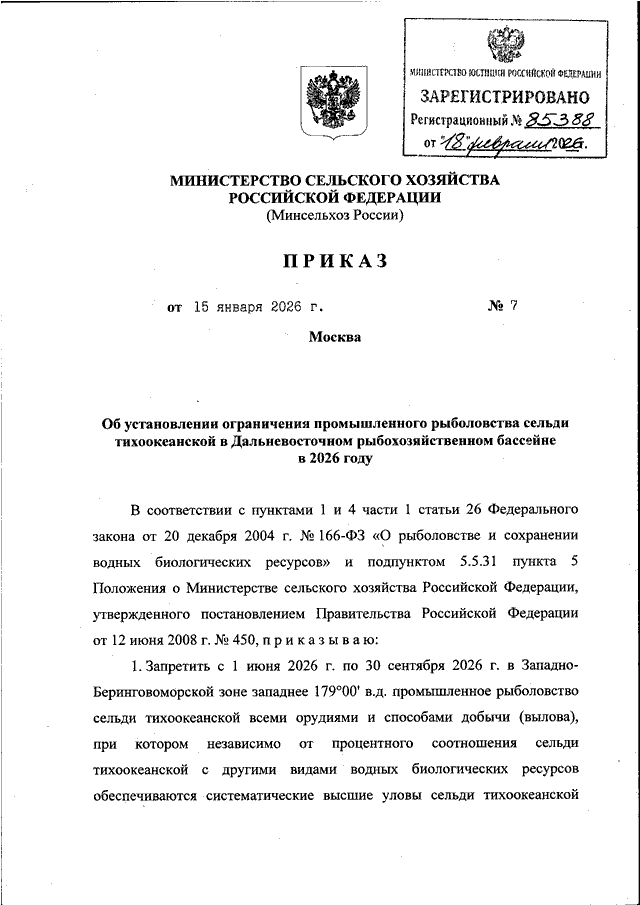 "ОБ УСТАНОВЛЕНИИ ОГРАНИЧЕНИЯ ПРОМЫШЛЕННОГО РЫБОЛОВСТВА СЕЛЬДИ ТИХООКЕАНСКОЙ В ДАЛЬНЕВОСТОЧНОМ РЫБОХОЗЯЙСТВЕННОМ БАССЕЙНЕ В 2026 ГОДУ"