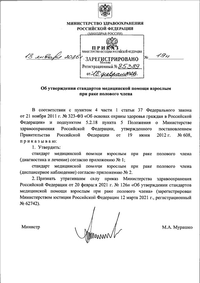 "ОБ УТВЕРЖДЕНИИ СТАНДАРТОВ МЕДИЦИНСКОЙ ПОМОЩИ ВЗРОСЛЫМ ПРИ РАКЕ ПОЛОВОГО ЧЛЕНА"