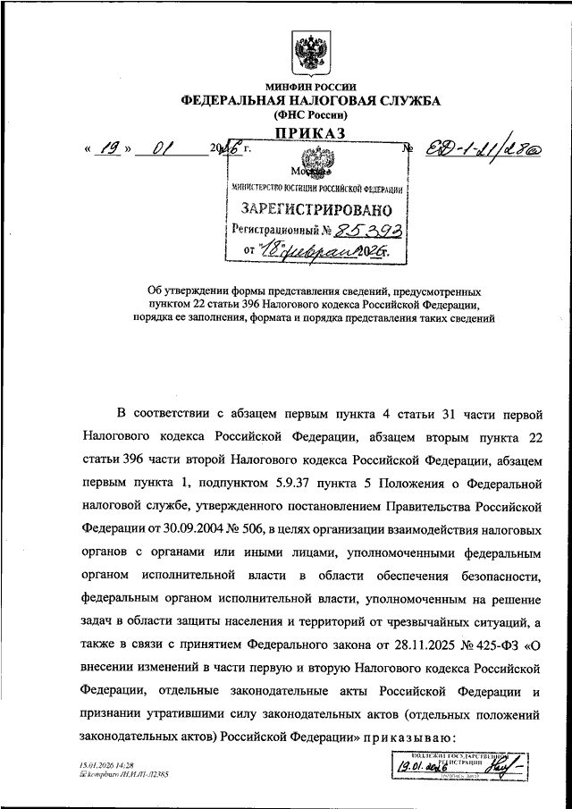 ПРИКАЗ ФНС РФ от 19.01.2026 N ЕД-1-21/28@