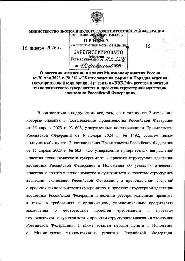 "О ВНЕСЕНИИ ИЗМЕНЕНИЙ В ПРИКАЗ МИНЭКОНОМРАЗВИТИЯ РОССИИ ОТ 30 МАЯ 2023 Г. N 361 "ОБ УТВЕРЖДЕНИИ ФОРМЫ И ПОРЯДКА ВЕДЕНИЯ ГОСУДАРСТВЕННОЙ КОРПОРАЦИЕЙ РАЗВИТИЯ "ВЭБ.РФ" РЕЕСТРА ПРОЕКТОВ ТЕХНОЛОГИЧЕСКОГО СУВЕРЕНИТЕТА И ПРОЕКТОВ СТРУКТУРНОЙ АДАПТАЦИИ ЭКОНОМИКИ РОССИЙСКОЙ ФЕДЕРАЦИИ"