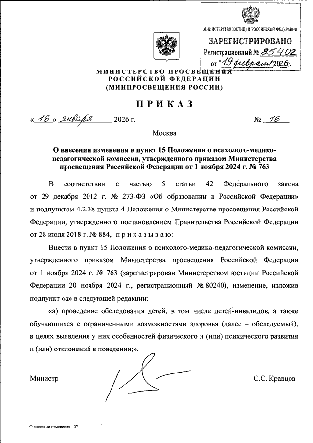 ПРИКАЗ Минпросвещения России от 16.01.2026 N 16