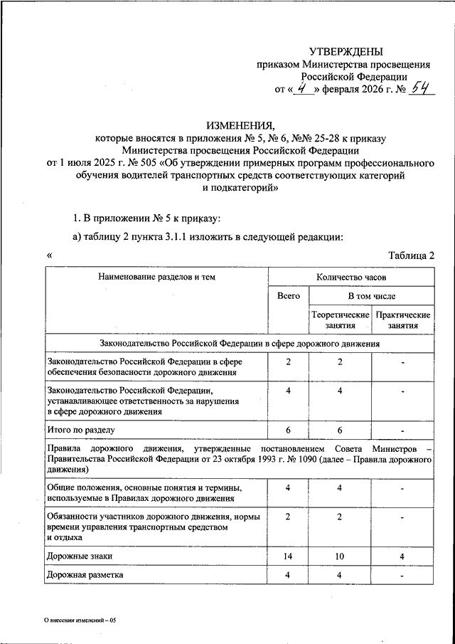 "О ВНЕСЕНИИ ИЗМЕНЕНИЙ В ПРИЛОЖЕНИЯ N 5, N 6, NN 25 - 28 К ПРИКАЗУ МИНИСТЕРСТВА ПРОСВЕЩЕНИЯ РОССИЙСКОЙ ФЕДЕРАЦИИ ОТ 1 ИЮЛЯ 2025 Г. N 505 "ОБ УТВЕРЖДЕНИИ ПРИМЕРНЫХ ПРОГРАММ ПРОФЕССИОНАЛЬНОГО ОБУЧЕНИЯ ВОДИТЕЛЕЙ ТРАНСПОРТНЫХ СРЕДСТВ СООТВЕТСТВУЮЩИХ КАТЕГОРИЙ И ПОДКАТЕГОРИЙ"