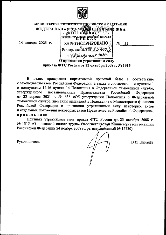 ПРИКАЗ ФТС РФ от 14.01.2026 N 11