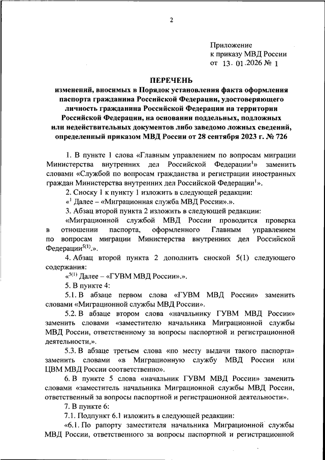 "О ВНЕСЕНИИ ИЗМЕНЕНИЙ В ПОРЯДОК УСТАНОВЛЕНИЯ ФАКТА ОФОРМЛЕНИЯ ПАСПОРТА ГРАЖДАНИНА РОССИЙСКОЙ ФЕДЕРАЦИИ, УДОСТОВЕРЯЮЩЕГО ЛИЧНОСТЬ ГРАЖДАНИНА РОССИЙСКОЙ ФЕДЕРАЦИИ НА ТЕРРИТОРИИ РОССИЙСКОЙ ФЕДЕРАЦИИ, НА ОСНОВАНИИ ПОДДЕЛЬНЫХ, ПОДЛОЖНЫХ ИЛИ НЕДЕЙСТВИТЕЛЬНЫХ ДОКУМЕНТОВ ЛИБО ЗАВЕДОМО ЛОЖНЫХ СВЕДЕНИЙ, ОПРЕДЕЛЕННЫЙ ПРИКАЗОМ МВД РОССИИ ОТ 28 СЕНТЯБРЯ 2023 Г. N 726"