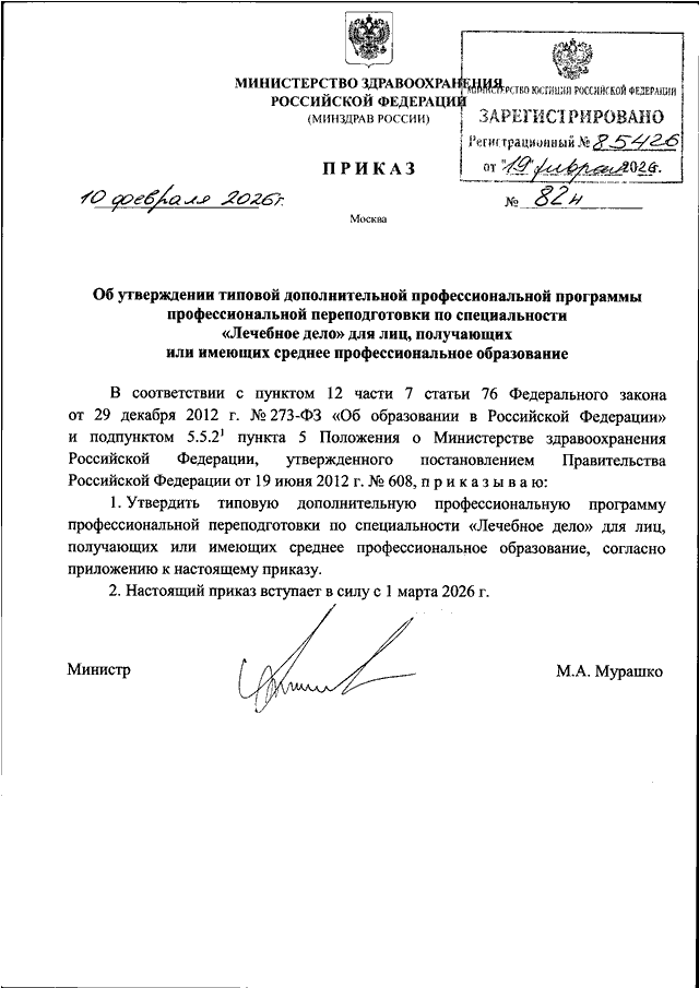 ПРИКАЗ Минздрава РФ от 10.02.2026 N 82н